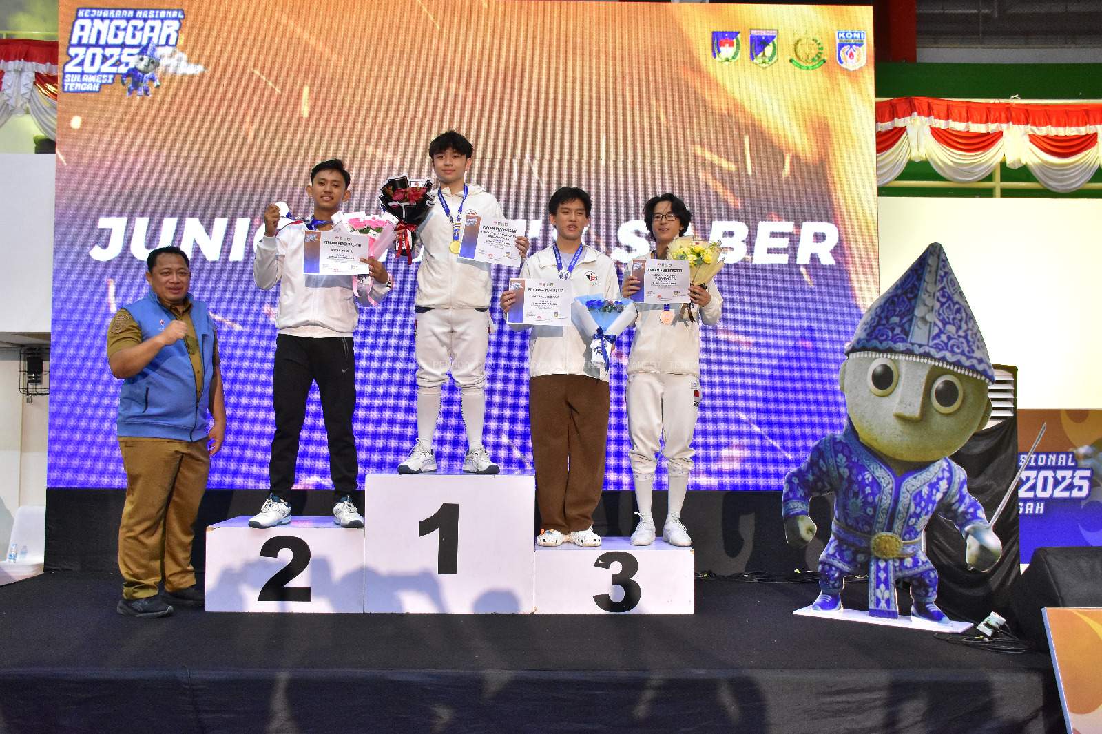 Palu, Sulawesi Tengah Kadispora Prov Sulteng Drs. Irvan Aryanto, M.Si menyerahkan medali kepada atlet anggar yang mengikuti Kejurnas Anggar Tahun 2025, bertempat di GBK Andi Raga Pettalolo. Selasa malam, 18/11/2025.